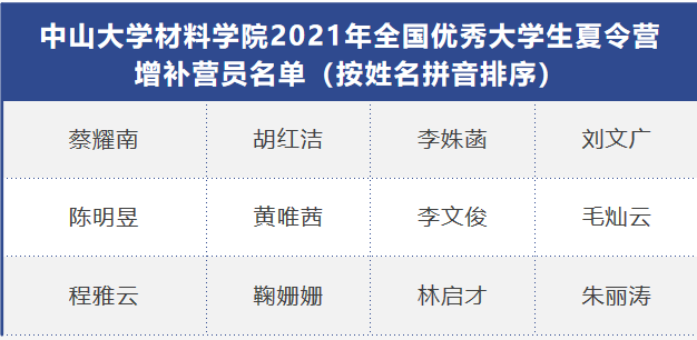 经材料学院夏令营营员资格审核小组对报名材料进行资格审核、综合评议,现将学院2021年全国优秀大学生夏令营增补营员名单公布如下: