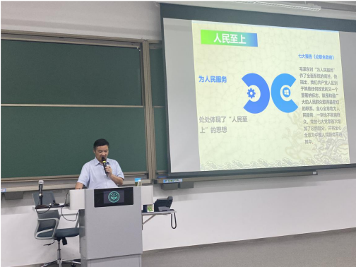 他讲解了自共和国成立以来毛泽东,邓小平,江泽民,胡锦涛和习近平主席的伟大精神谱系,指出历史虽在不断演变,但不变的是中国共产党的始终情系人民的本心。他指出,正是由于无数像李大钊、焦裕禄、钱学森、钟南山一样的优秀共产党人的奋斗和奉献,中华民族伟大复兴的中国梦才得以一步一步实现。李书记讲解了《为人民服务》的历史背景和理论贡献,他指出“为人民服务”在每个历史时期的含义是不一样的,在当代,“为人民服务”的一项重要内涵就是脱贫攻坚。