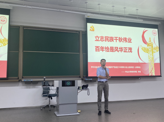 李斌副院长发表了以“回顾重要讲话,汇报学习心得”为主题的讲话。2021年7月1日,中国共产党迎来了百年华诞,习近平总书记在天安门广场发表了“七一“重要讲话,回望了光辉历程,擘画了光明前景。他从中国共产党的诞生,党百年奋斗的伟大成就,伟大建党精神,未来共产党的方向四个方面回顾了习近平总书记重要讲话,过去一百年,中国共产党向人民,向历史交出了一份优异的答卷,完成了全面建成小康社会的历史任务,现在,中国共产党团结带领中国人民又踏上了实现第二个百年奋斗目标新的赶考之路。他指出,”中国共产党立志于中华民族千秋伟业,百年恰是风华正茂!”,我们的党仍有很长的路要走,仍然有很多的事业需要努力完成,才能真正实现中华民族的伟大复兴。十四五期间,中山大学也迎来百年华强,同样风华正茂,同样需要继续砥砺前行。李斌院长对同学们提出了做“有本事,有特点,有意义,有贡献“的中大人的要求,希望同学们在今后的求学道路中要砥砺前行,为实现中华民族伟大复兴的中国梦而奋斗。