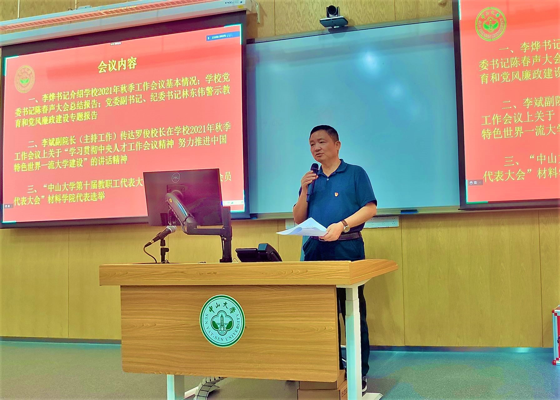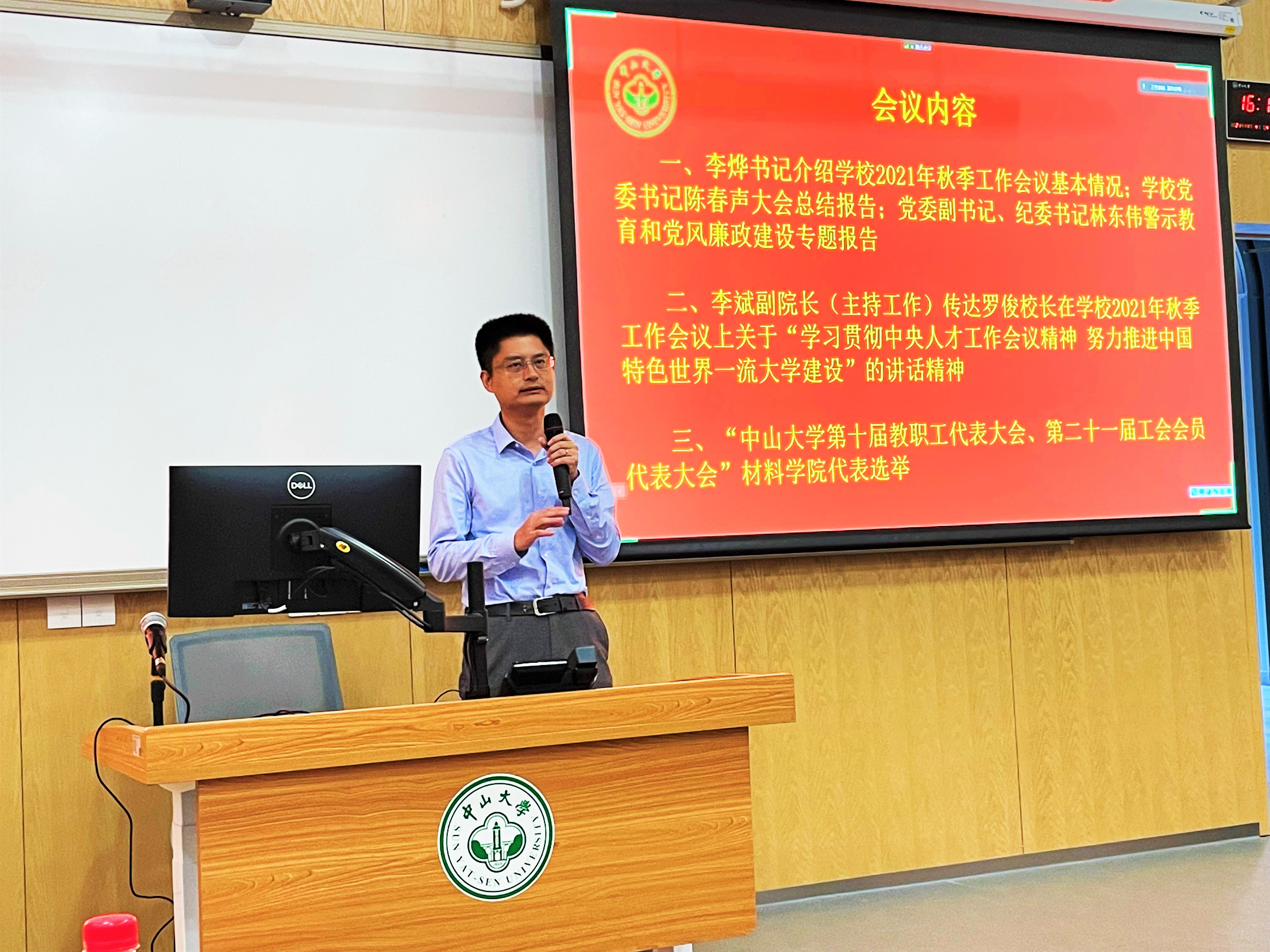 11月4日下午,材料学院召开全院教职工大会传达学习学校2021年秋季工作会议精神。学院党政领导班子和全体教职工参加会议。在深圳校区主会场之外,还特别在广州校区东校园设置了分会场,以保证全体教职工均可以方便参会学习。会议由李斌副院长(主持工作)主持。