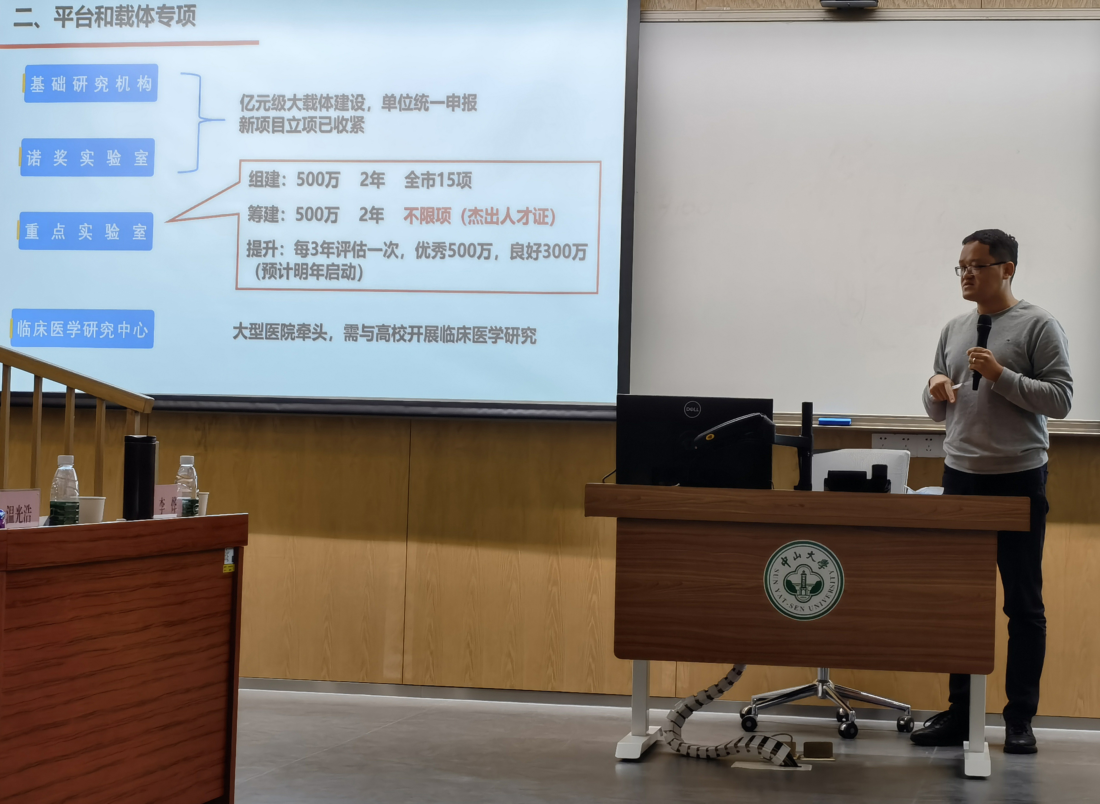 科研处项目资源办刘毅主任作了题为《深圳市科技计划项目管理交流》的讲座报告。刘毅主任长期从事深圳市科技计划项目、国防战略高科技前沿科技计划项目的申报、全流程管理工作,2011年-2014年期间市科创委挂职。刘主任介绍了深圳市科技计划项目资助体系、改革举措等;讲解了深圳市科创委基础研究、平台和载体、人才、创新创业、协同创新、市级工程研究中心扶持计划及关键核心技术攻关等项目的定位与要求、申报与评审流程等;分享了对深圳市科创委科技计划项目申报及管理的体会。