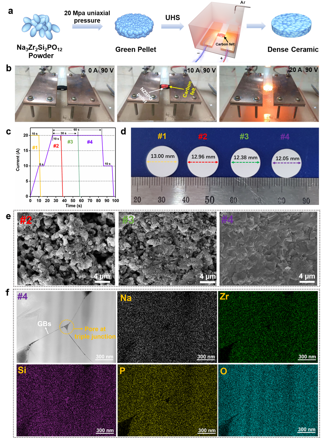 钠离子电池(SIBs)由于利用丰富且成本低廉的钠资源,有望用于大规模储能和国家电网应用。使用无机固态电解质构筑的固态 SIBs 因为直接金属钠负极可以提供高能量密度和长循环稳定性。在众多的Na快离子导体中,NASICON 型Na3Zr2Si2PO12 (NZSPO)因其在室温下超过 10-4 S cm-1 的高离子电导率,对空气/水分更稳定而备受关注。目前,在SSE制备的许多方面仍然存在挑战,包括长时间烧结和高温处理(> 1100 ℃)以尽量减少气孔、晶界对离子电导率的影响。事实上,陶瓷材料的长时间加工和高烧结温度(>1100 ℃)往往存在明显的缺点,包括轻元素(Na、Li、P)的损失、杂质的形成、与有机材料的不相容性和高成本等弊端。在这种情况下,为了提高实用性和降低成本,非常需要快速和新颖的烧结技术来制备固态电解质,而不会影响其电化学/化学性能。