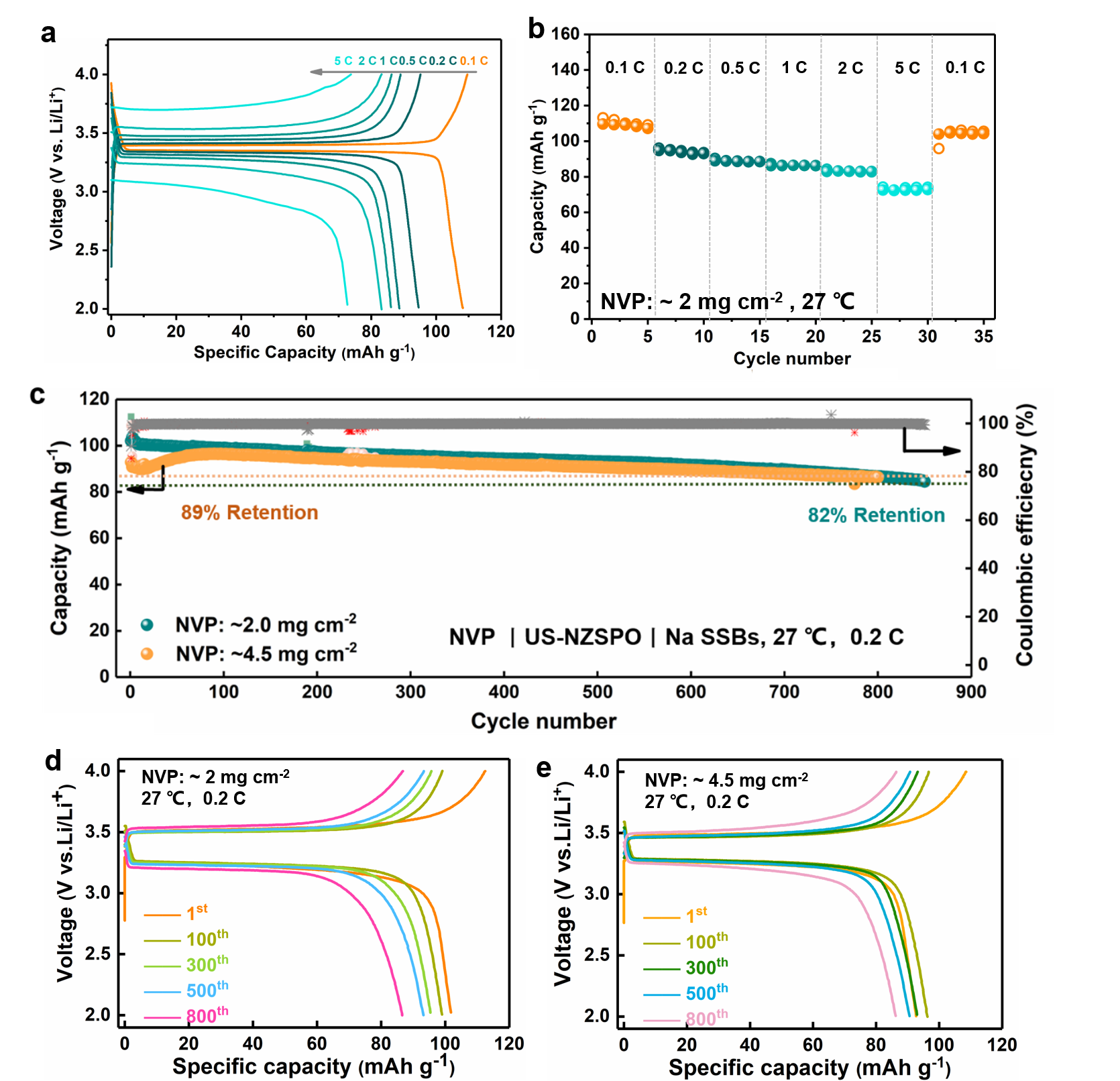 然后,构筑的Na3V2(PO4)3|US-NZSPO | Na固态电池,在2.0 - 4.0 V电压范围内首周循环容量达到了109.6 mAh g-1,对应于库仑效率为93.7%。在正极负载约为 2 mg cm-2, 850次循环后,放电容量为84.4 mAh g-1,容量保持率为82%,库仑效率超过99.3%;将正极负载提升到4.5 mg cm-2,固态电池的可逆容量为 86.3 mAh g-1,在 0.2 C 下 800 次循环后容量保持率为 89%。