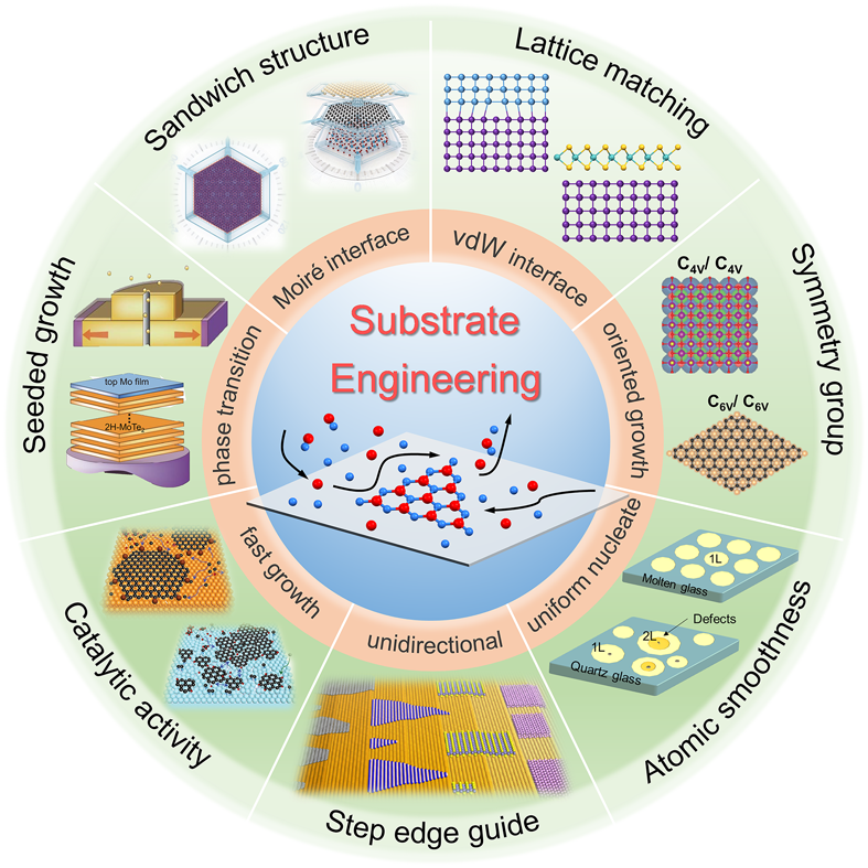 图 1. 生长二维材料的衬底工程示意图。7种衬底工程策略:晶格匹配、空间对称群匹配、催化表面、原子级平整表面、台阶诱导、夹层结构、晶种诱导。