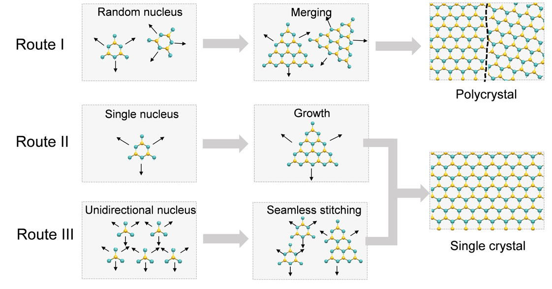 图 2. 生长晶圆级二维材料的三种路线(以TMDCs为例)。路线I:随机成核拼接为多晶薄膜;路线II:单点成核生长为单晶薄膜;路线III:定向成核无缝拼接为单晶薄膜。