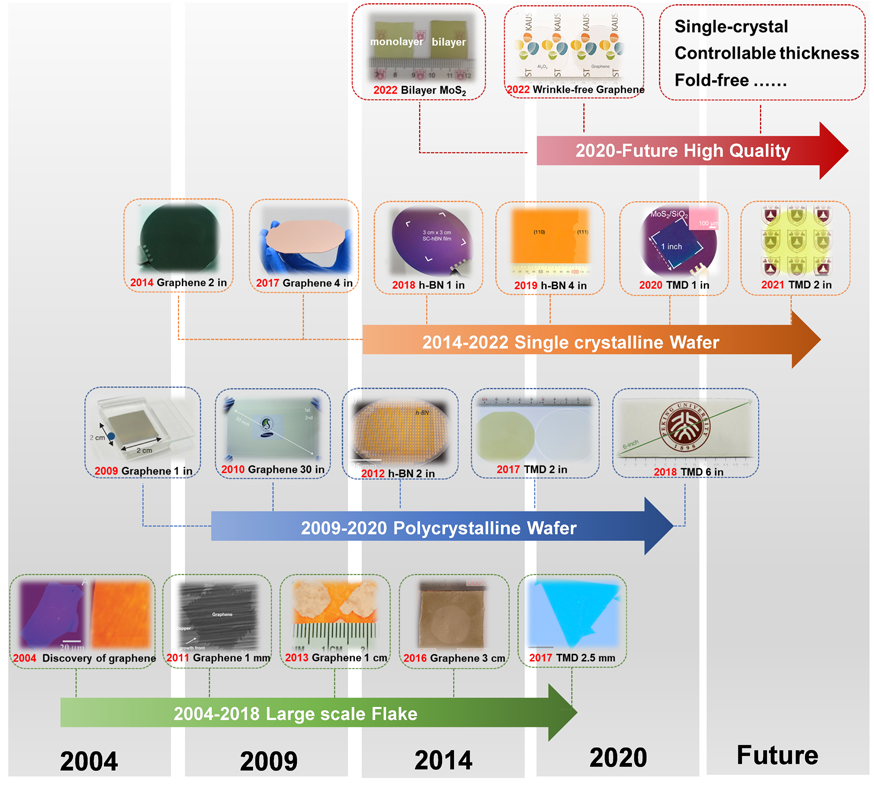 图 3. 大尺寸二维材料发展里程碑。Large scale flake指通过单点成核生长的单晶片,尺寸通常较小,生长速度较慢;Polycrystalline wafers是指通过随机成核拼接形成的多晶薄膜,通常尺寸较大,但含有大量晶界;Single crystalline wafers是指通过定向成核无缝拼接形成的单晶薄膜,通常尺寸较大,晶界非常少。二维材料的生长趋势:大尺寸单晶片→多晶晶圆→单晶晶圆→高质量单晶晶圆。