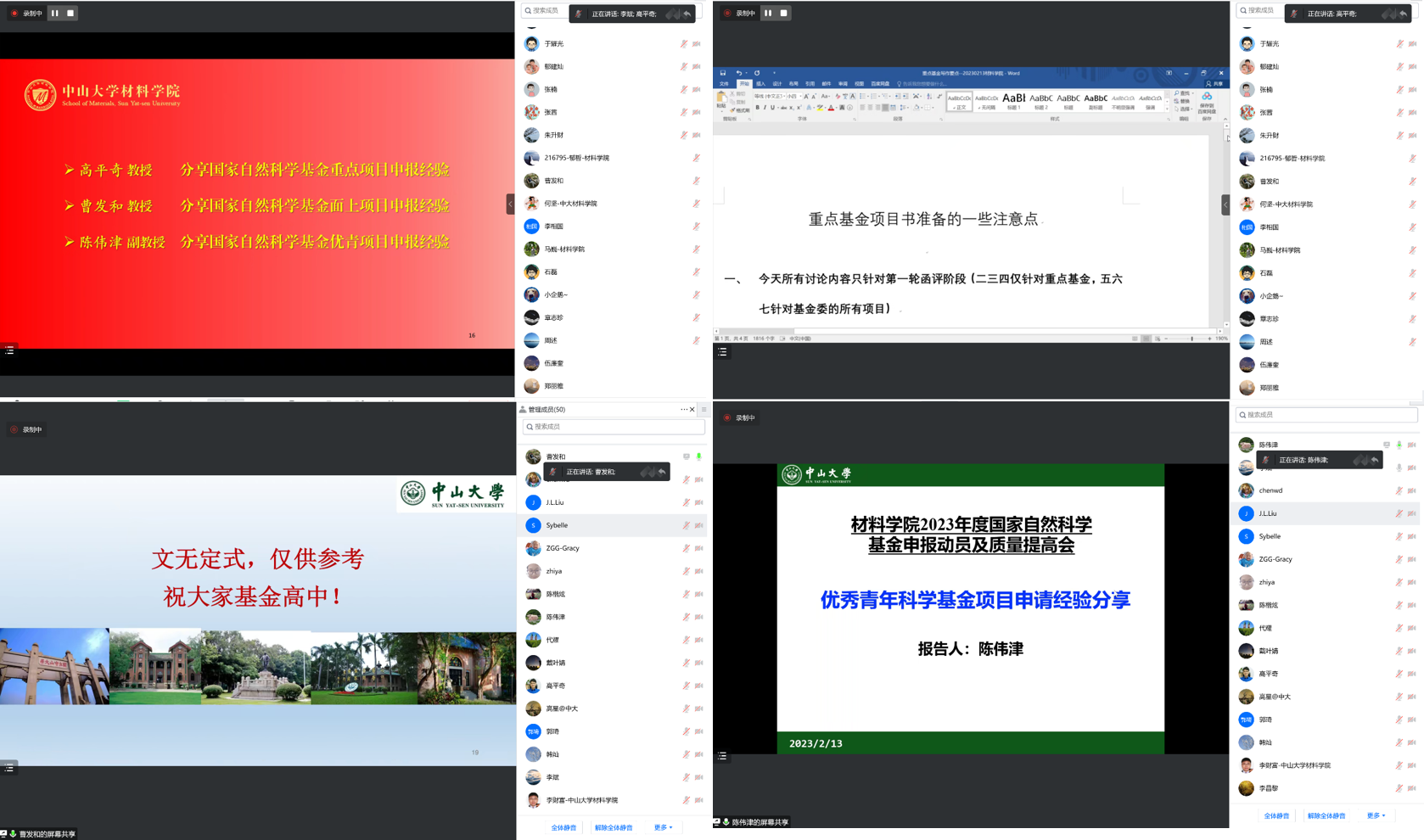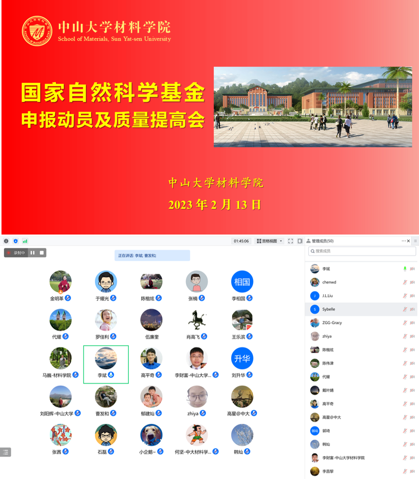 为贯彻落实习近平总书记关于基础研究的系列重要指示批示精神,进一步提升学院国家自然科学基金申请数量和质量,助力学校高质量内涵式发展,2月13日上午,材料学院召开“2023年度国家自然科学基金申报动员及质量提高会”。会议由副院长李斌教授主持,副院长高平奇教授、院长助理曹发和教授以及科研人员50余人参加了线上会议。
