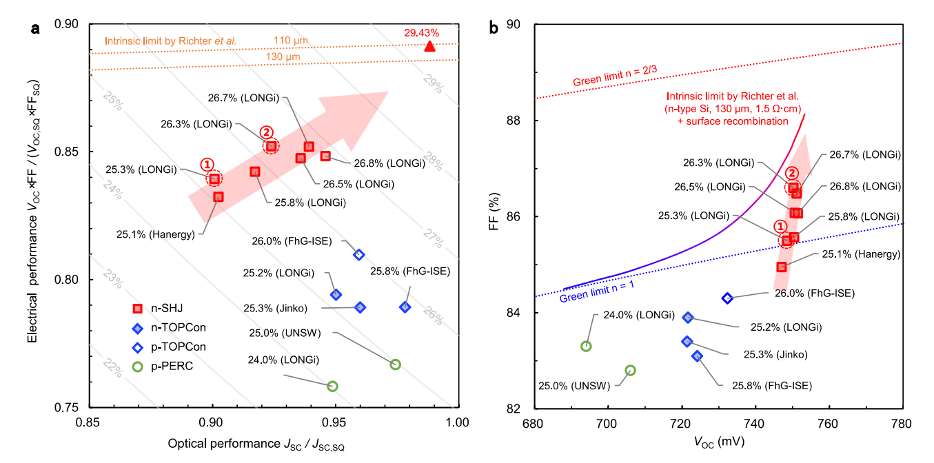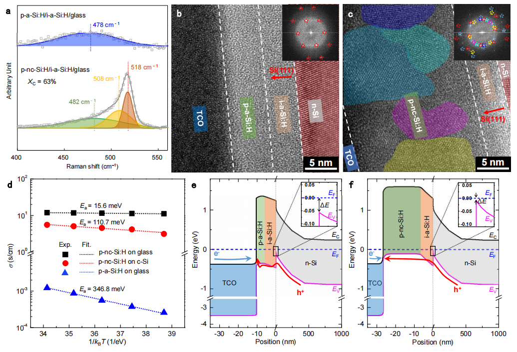 进一步的分析表明, p-nc-Si:H相比于p-a-Si:H,在晶化率(图3a)、电导率和激活能上(图3d)均具有明显的优势。使得空穴载流子基于p-nc-Si:H空穴接触层的SHJ电池中相较于p-a-Si:H对比电池更容易传输(图3ef),同时具有更佳的钝化性能,从而利于实现更优的载流子选择性钝化接触特性。测试表明,由p-nc-Si:H所组成的异质结,其接触电阻和表面复合分别降低为5mΩ.cm20.5fA.cm-2。这使得电池的开路电压和FF分别上升至751.4mV86.07%据德国哈梅林太阳能研究所ISFH认证,该电池的能量转换效率高达26.81%,这是目前单结晶体硅太阳电池能量转换效率的世界纪录(不区分技术路线)!