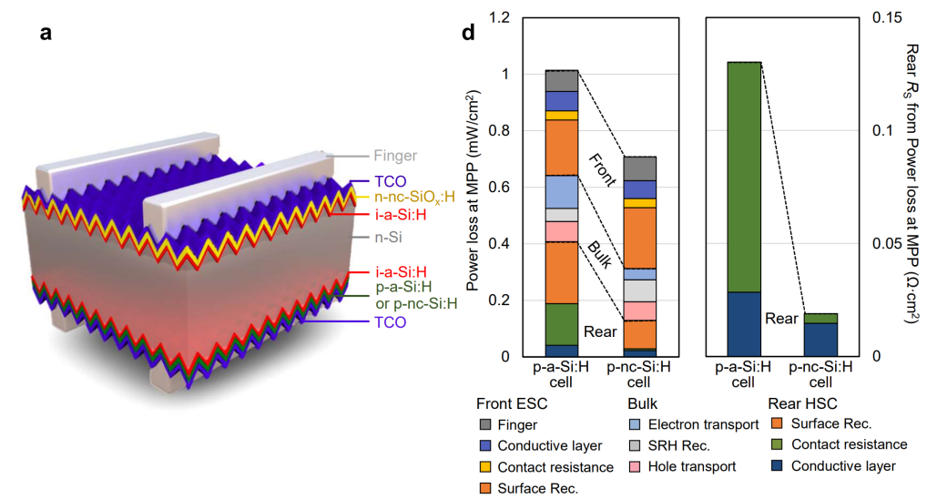 本文首先从光电性能的对比上(图1a),指出隆基的硅异质结(n-SHJ,红色方框)电池相较于其它电池技术展现出的突出电学性能,在叠加上光学方面的优化,完全可以在传统的前背接触结构(FBC电池上实现更高的电池效率。更细化的电学分析表明(图1b),FF上的快速提升,尤其在超越理想因子为1的极限曲线(蓝色虚线)后,是电池电性能进一步提升的关键。这种提升,归因于电池背结的掺杂膜层由p型掺杂非晶薄膜(p-a-Si:H)替换为p型掺杂纳晶薄膜p-nc-Si:H后,空穴接触侧接触电阻的快速下降(如图2所示)。
